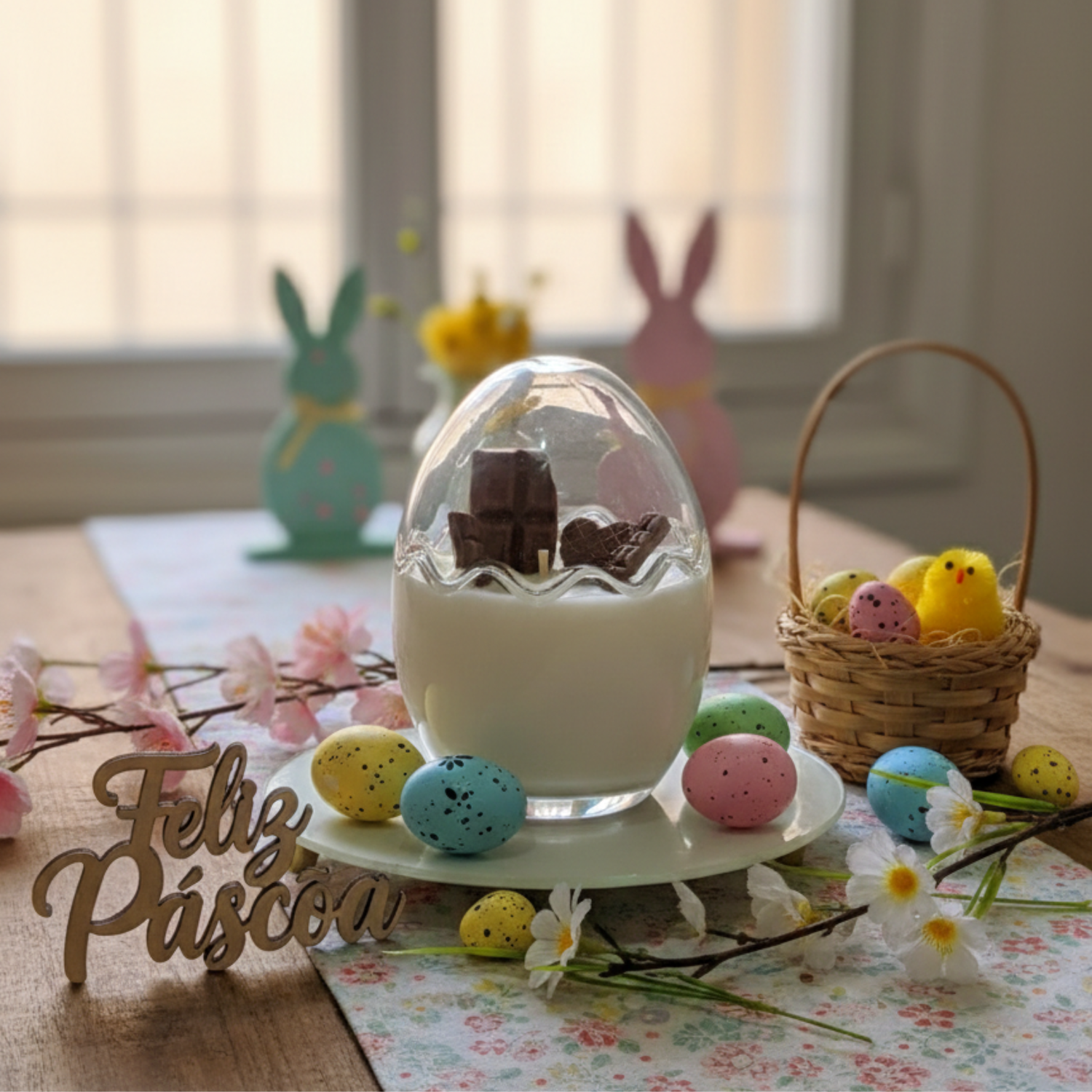 Design: Lindo recipiente em vidro transparente, em formato de ovo de páscoa, contendo 140 gramas de vela, além de elementos decorativos também em cera de côco, em formatos de chocolates.
